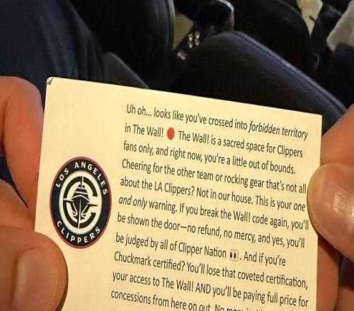 北京时间1月23日,在快船对阵湖人的洛城德比中,快船队取得了最后的胜利。赛后,美媒ClutchPoints晒出了一张图片,图片中是快船主场发放的“警告小卡片”,这是针对于湖人球迷强行坐