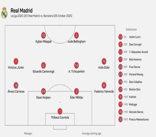 25岁15天,皇马派出了近20个赛季国家德比中最年轻首发阵容